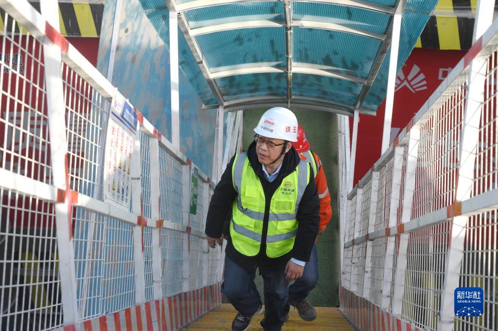 梅東冬在雄安新區至北京大興國際機場(chǎng)快線(xiàn)(R1線(xiàn))一標段項目工地巡查(1月18日攝)。