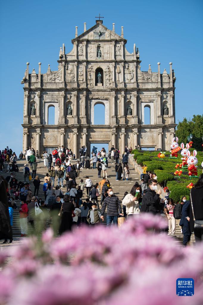 1月18日,游客在澳門(mén)大三巴牌坊前游覽。