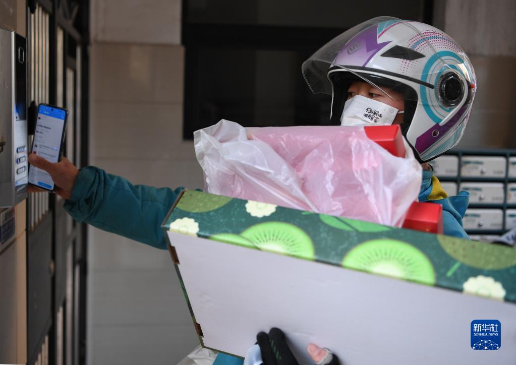 李文在西安市灞橋區一小區內配送商品(1月18日攝)。