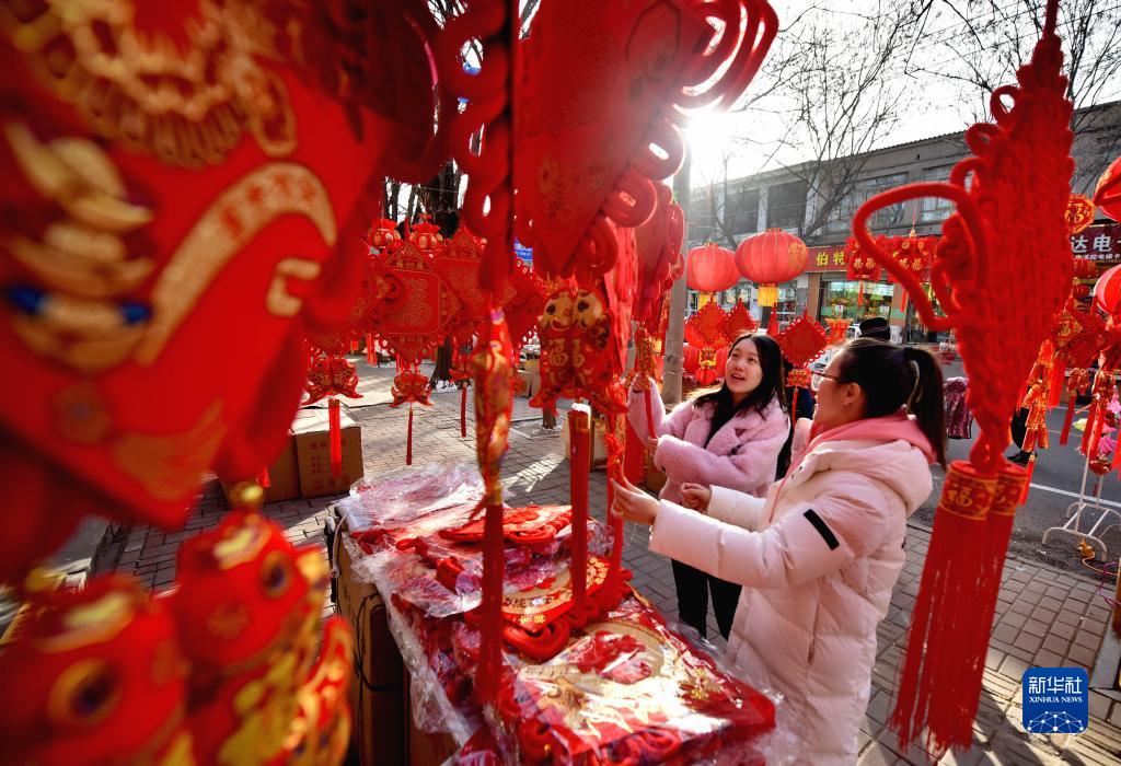 1月20日,市民在河北省邢臺市南和區和陽(yáng)鎮年貨集市購買(mǎi)節慶飾品。