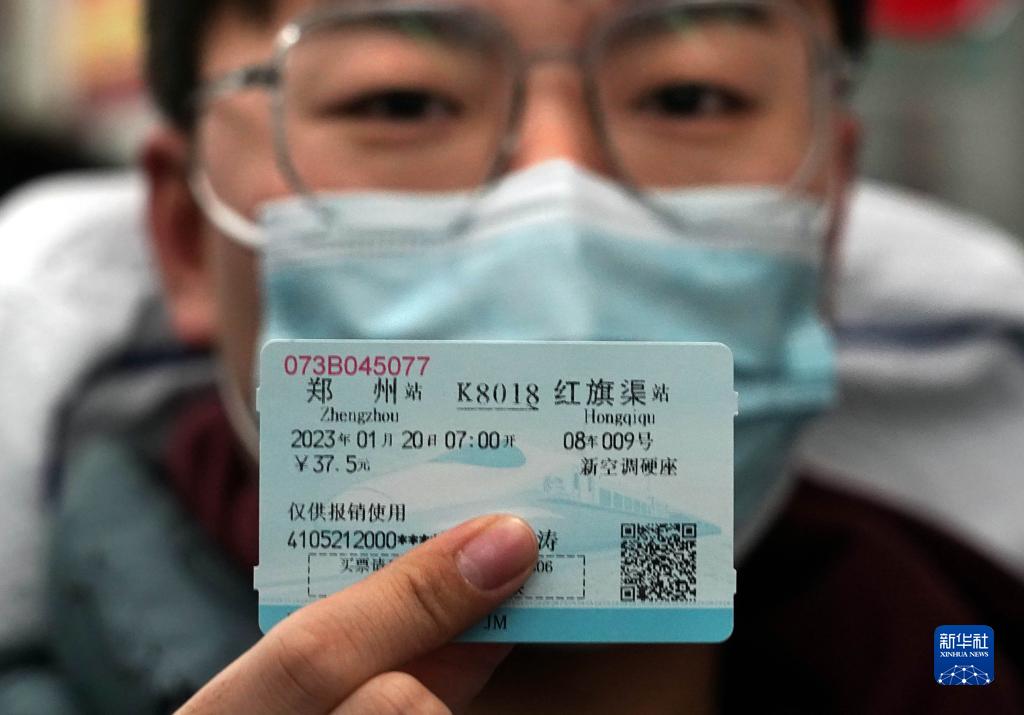 1月20日,旅客在首趟“紅旗渠”號列車(chē)上展示車(chē)票。