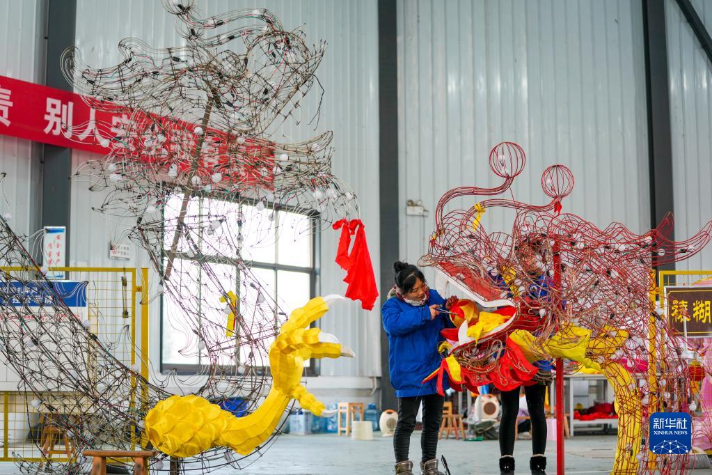 1月19日,在重慶市銅梁區太平鎮坪漆村龍燈彩扎基地的鄉村振興車(chē)間內,兩名村民制作銅梁龍燈。