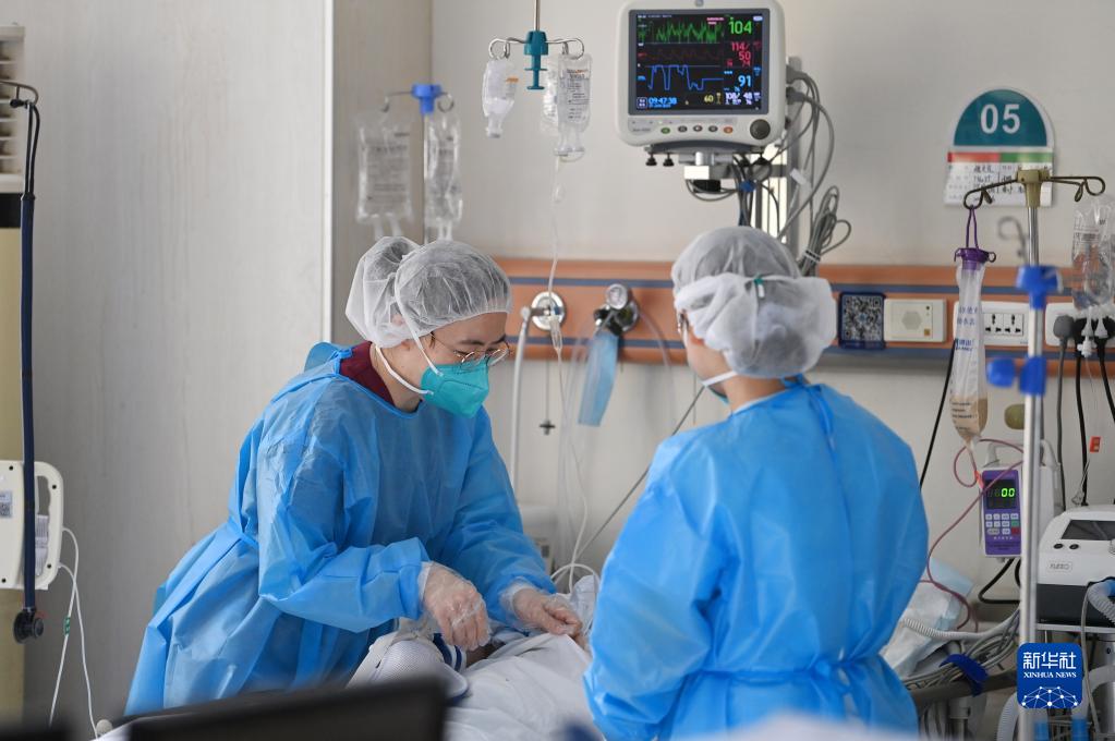 1月21日,在天津醫科大學(xué)總醫院呼吸與危重癥醫學(xué)科,兩位醫護人員在患者床前工作。
