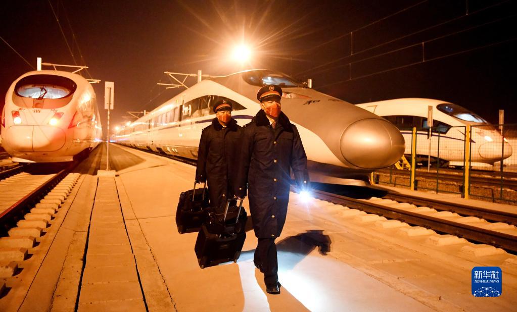 1月21日凌晨,在河南省洛陽(yáng)市動(dòng)車(chē)組存車(chē)場(chǎng),洛陽(yáng)機務(wù)段高鐵司機準備上車(chē)出勤。