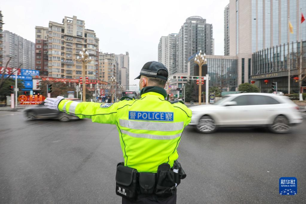1月21日,貴州省畢節市七星關(guān)區交警大隊機動(dòng)中隊隊員指揮車(chē)輛通行。