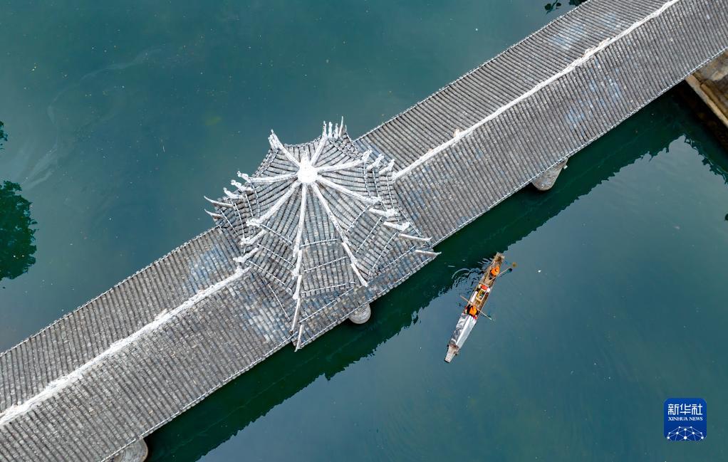1月21日,湖南省懷化市通道侗族自治縣雙江鎮,環(huán)衛工人在江面上打撈漂浮物 (無(wú)人機照片)。