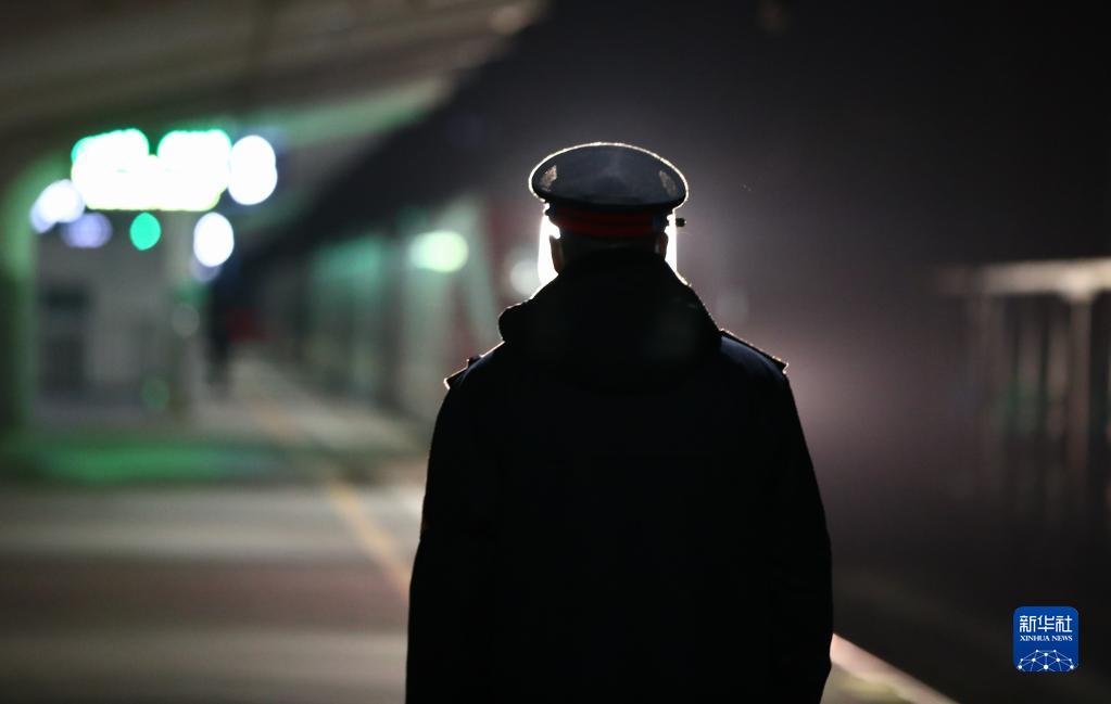 1月21日,在山東省滕州市火車(chē)站,值班員韓生平在站臺準備接車(chē)。