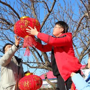 1月20日,沈陽(yáng)工學(xué)院老師和李天騏(中)一起掛燈籠。