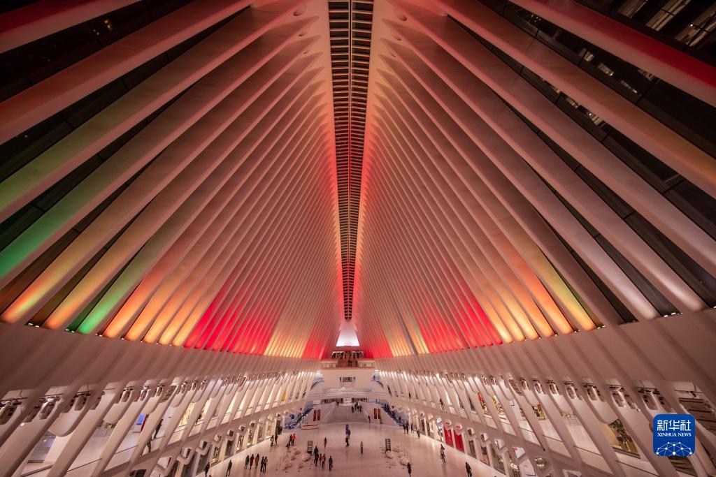 1月20日,美國紐約的世貿中心車(chē)站亮起燈光慶祝中國春節。