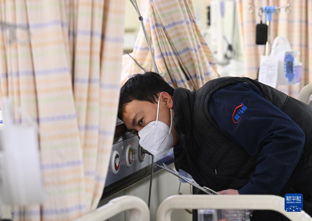 1月21日,在北京大學(xué)第一醫院急診科搶救室內,工作人員俯身通過(guò)聽(tīng)覺(jué)檢查墻壁供氧裝置的運行情況。