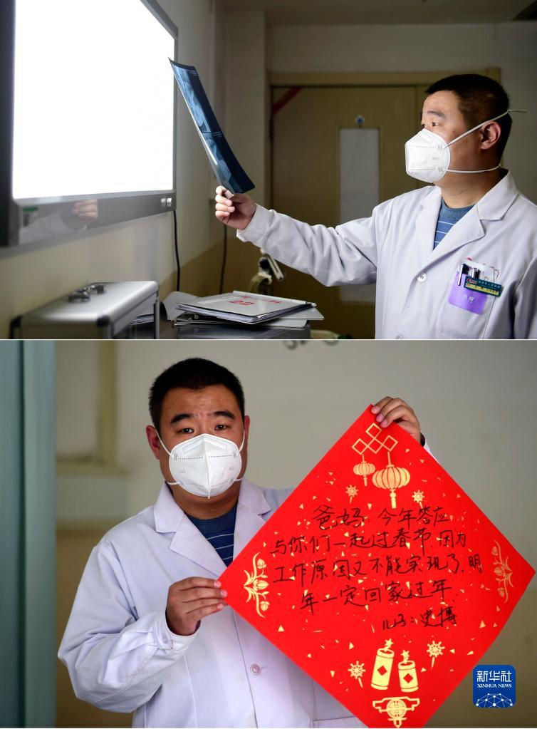 拼版照片:1月21日,滄州市人民醫院創(chuàng )傷脊柱骨科醫生史博在查看患者影像(上圖);史博寫(xiě)的“致歉語(yǔ)”:“爸媽?zhuān)航衲甏饝c你們一起過(guò)春節,因為工作原因又不能實(shí)現了,明年一定回家過(guò)年”(下圖)。
