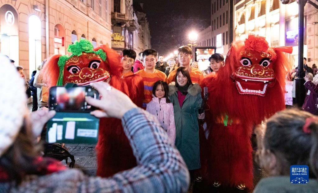 1月21日晚,在塞爾維亞首都貝爾格萊德舉行的“歡樂(lè )春節——絲綢之路上的友誼大篷車(chē)”活動(dòng)上,當地民眾與舞獅表演者合影。
