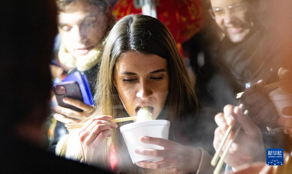 1月21日晚,在塞爾維亞首都貝爾格萊德舉行的“歡樂(lè )春節——絲綢之路上的友誼大篷車(chē)”活動(dòng)上,一名塞爾維亞女子品嘗餃子。