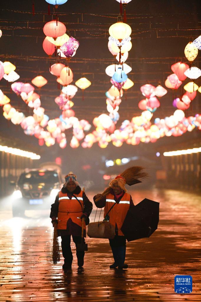 1月22日,在貴州省黔東南苗族侗族自治州黃平縣舊州古鎮,環(huán)衛工人凌晨清掃街道結束后返程回家。