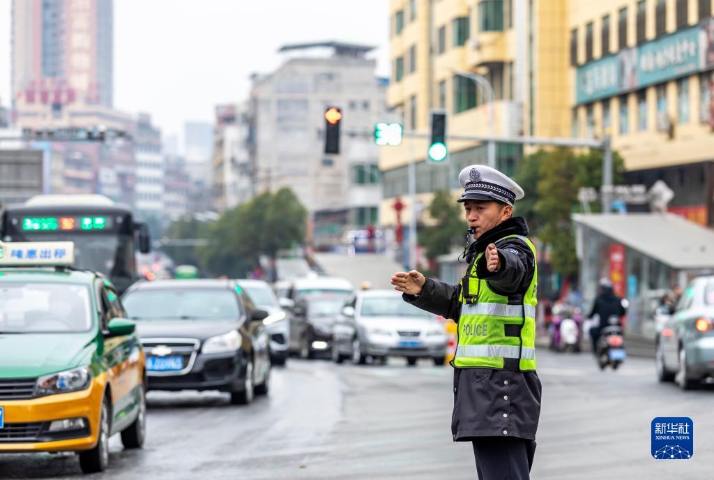1月21日,交警在湖南省隆回縣桃洪中路指揮交通。