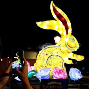 1月21日晚,游客在英國倫敦特拉法加廣場(chǎng)拍攝兔子彩燈。