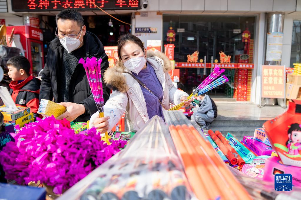 1月22日,在湖北省竹山縣,兩名顧客在購買(mǎi)鞭炮。
