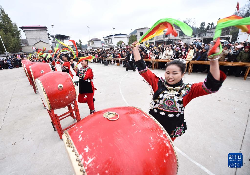 1月22日,在貴州省銅仁市松桃苗族自治縣正大鎮麻塘村,苗族同胞身著(zhù)節日盛裝打花鼓慶新春。