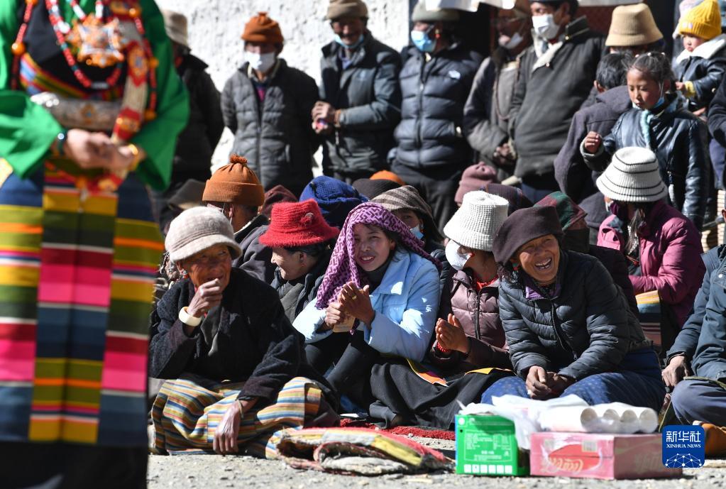 西藏日喀則市芒普鄉普村村民觀(guān)看文藝演出隊表演(1月21日攝)。