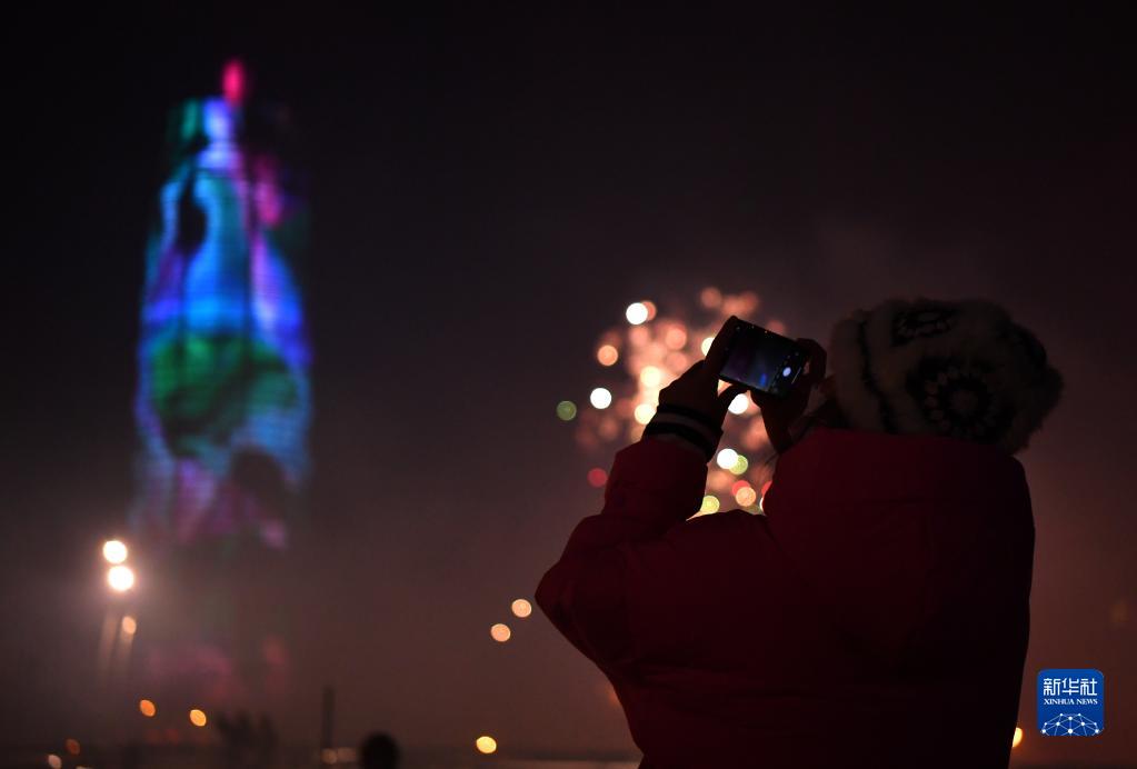 1月21日晚,市民在鄭州市鄭東新區千璽廣場(chǎng)附近觀(guān)看燈光秀。
