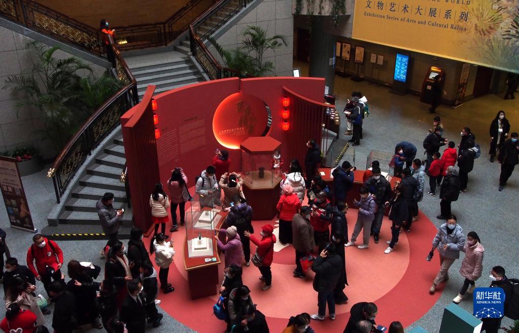 1月22日,觀(guān)眾在上海博物館大堂里觀(guān)看兔年迎春展。