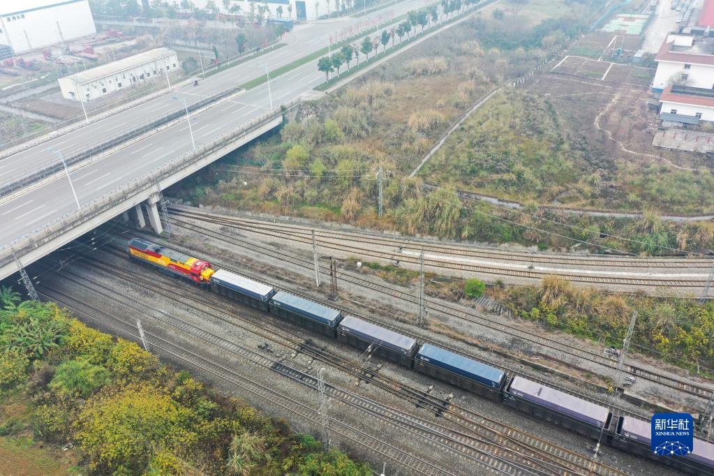 1月22日,兔年首趟西部陸海新通道鐵海聯(lián)運班列從重慶團結村中心站發(fā)車(chē)(無(wú)人機照片)。