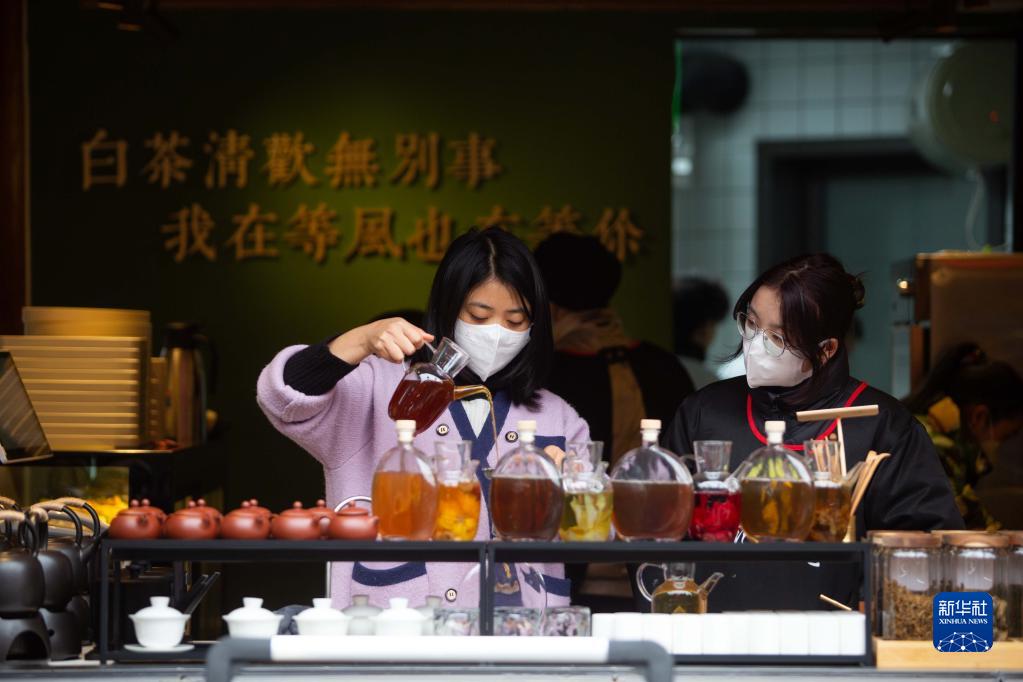 1月22日,在貴州省安順市西秀區安順古城歷史文化街區,一家茶飲店鋪工作人員在為顧客準備茶飲。