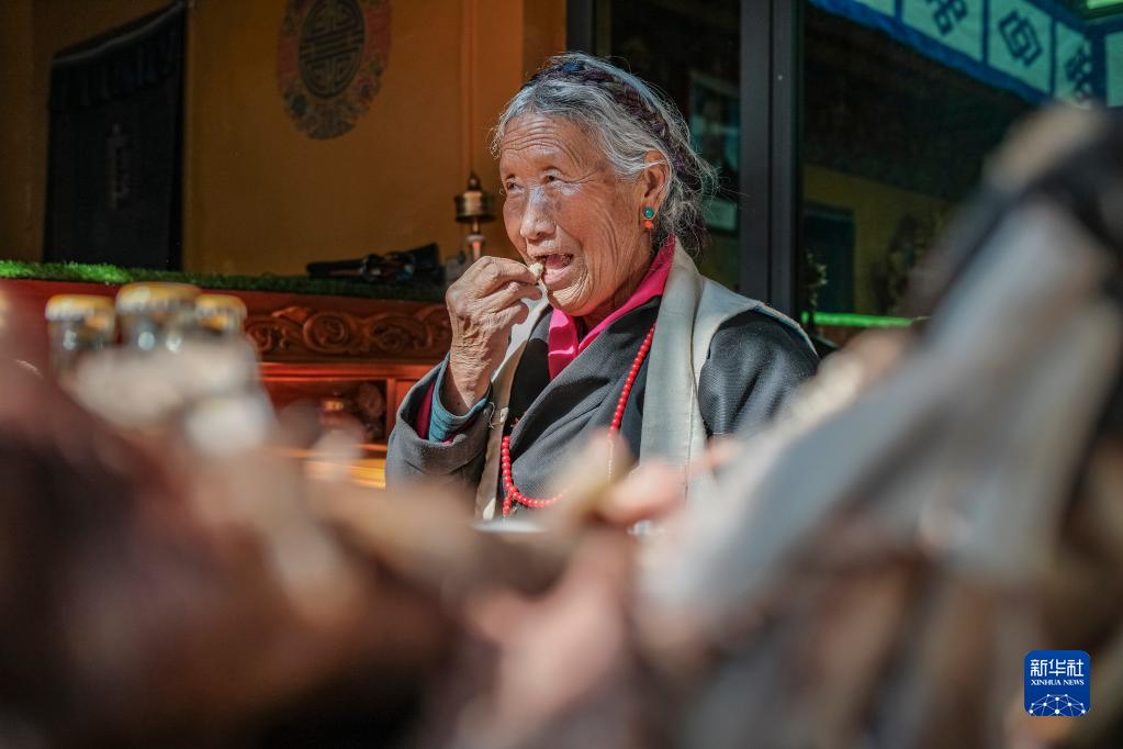 在位于西藏日喀則拉孜縣扎西宗鄉雜村的家中,次旦老人一臉幸福的微笑,家中小輩正輪流上前和她行碰頭禮。