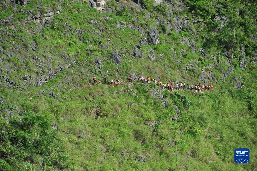 蒙宣任、蒙宣汰兄弟和同學(xué)結伴走在回家的山路上(2012年7月4日攝)。
