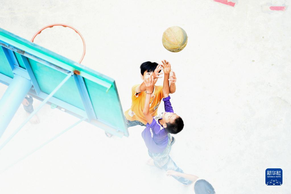 在弄勇小學(xué)讀六年級的蒙宣任(左)在打籃球(2015年5月7日攝)。