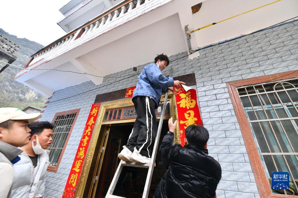 在大化瑤族自治縣板升鄉弄勇村弄頂屯,蒙宣汰(上)在貼對聯(lián)(2023年1月21日攝)。