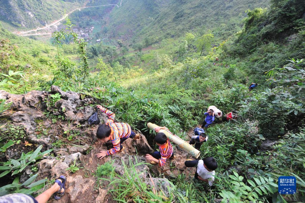 在大化瑤族自治縣板升鄉弄勇村弄頂屯,蒙宣汰(左一)、蒙宣任(左二)爬山路去學(xué)校(2012年9月3日攝)。