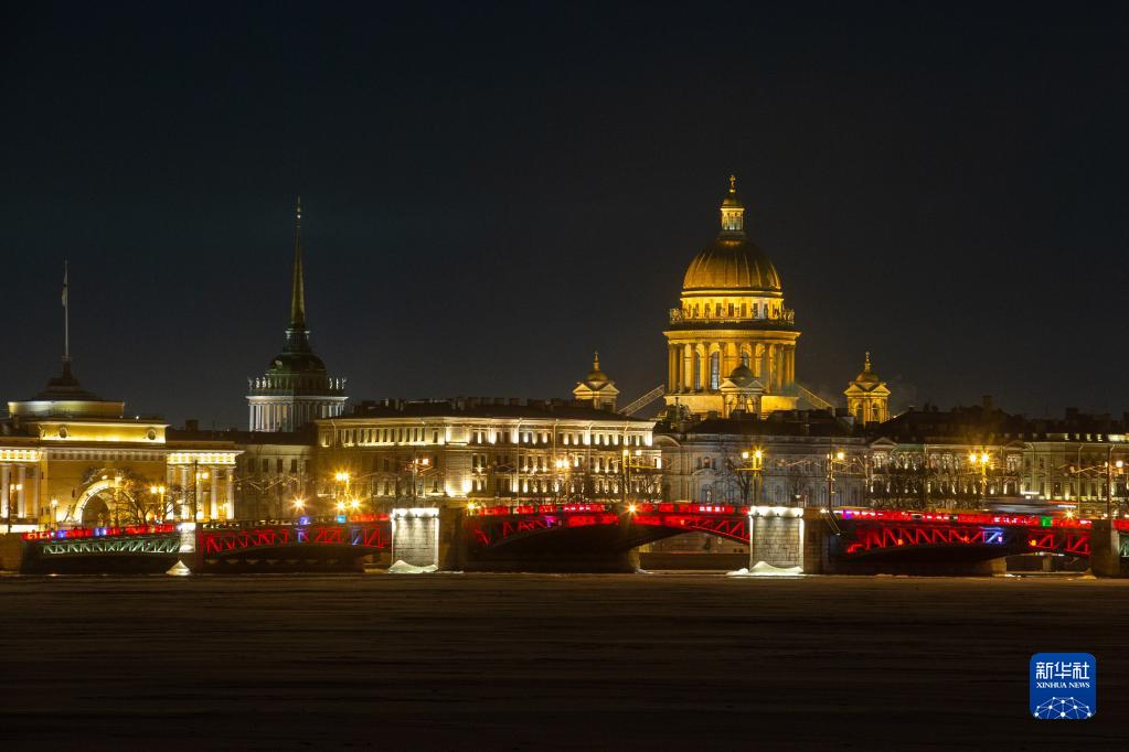 1月21日晚,俄羅斯圣彼得堡市中心涅瓦河上的地標性建筑冬宮橋亮起“中國紅”,迎接兔年春節的到來(lái)。