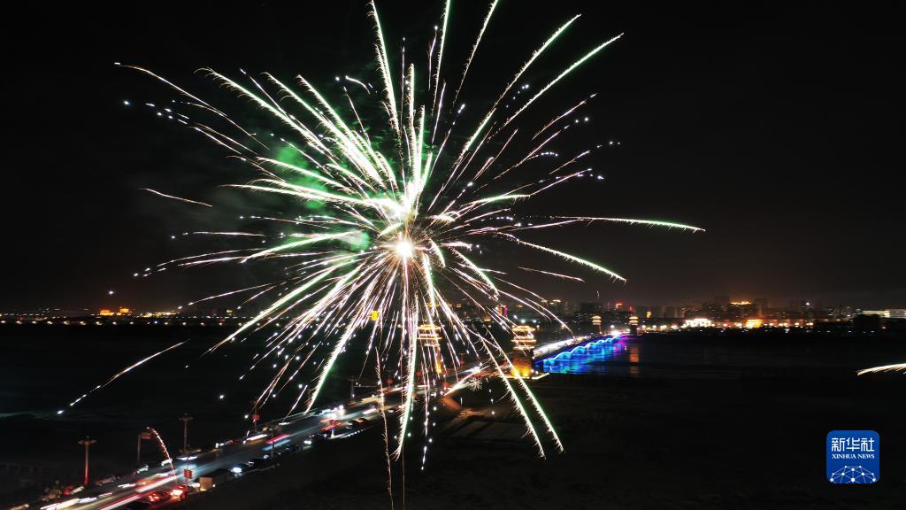 1月21日除夕夜,新年煙花在甘肅省張掖市黑河大橋上空綻放(無(wú)人機照片)。