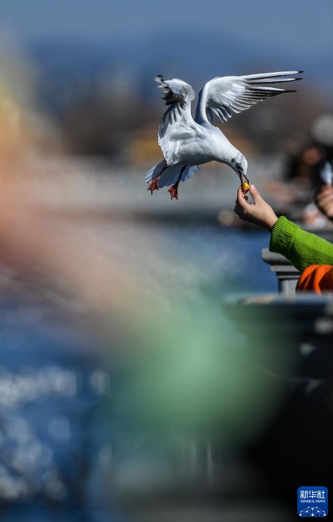 1月23日,游客在昆明市滇池海埂大壩上投喂紅嘴鷗。