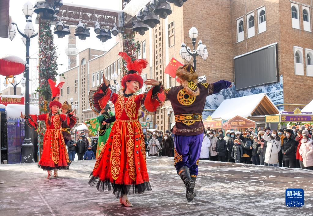1月23日,在烏魯木齊大巴扎景區,市民和游客觀(guān)賞慶新春歌舞表演。