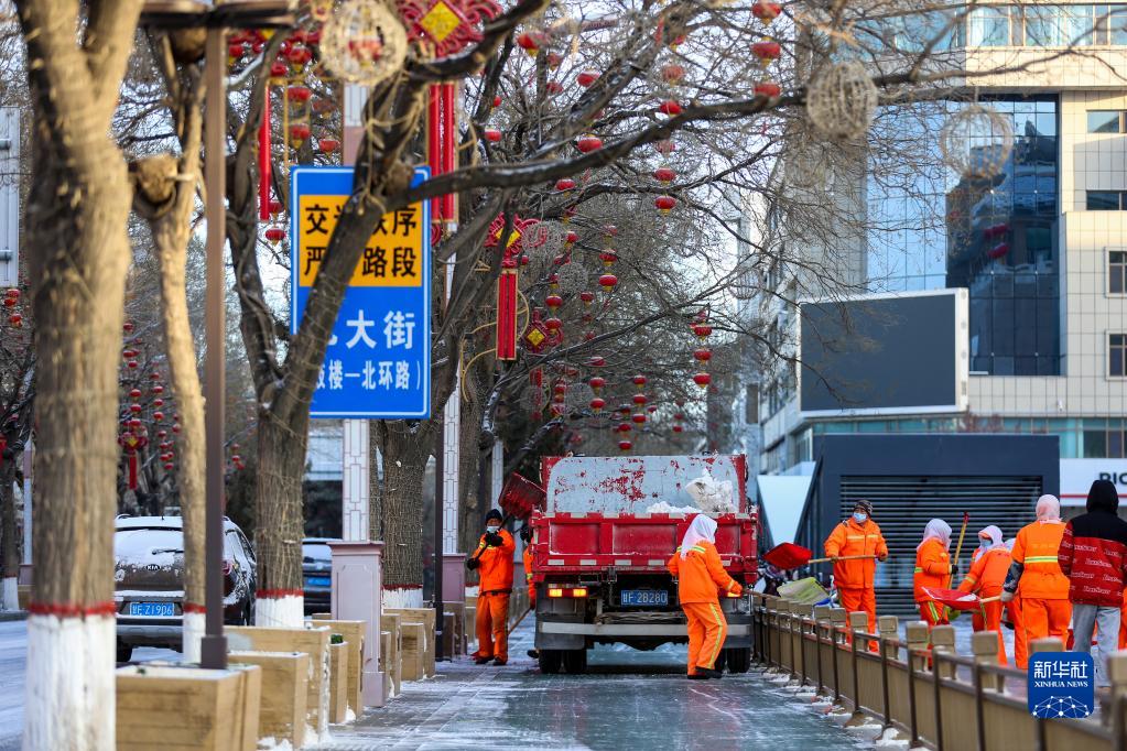 1月23日,在甘肅省酒泉市北大街,環(huán)衛工人在清理路面上的積雪。