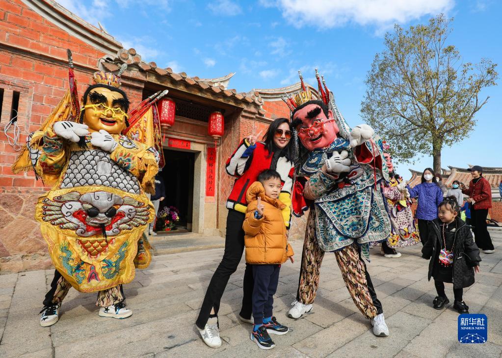 1月24日,在福建晉江梧林傳統村落,游客與“電音三太子”演員合影。