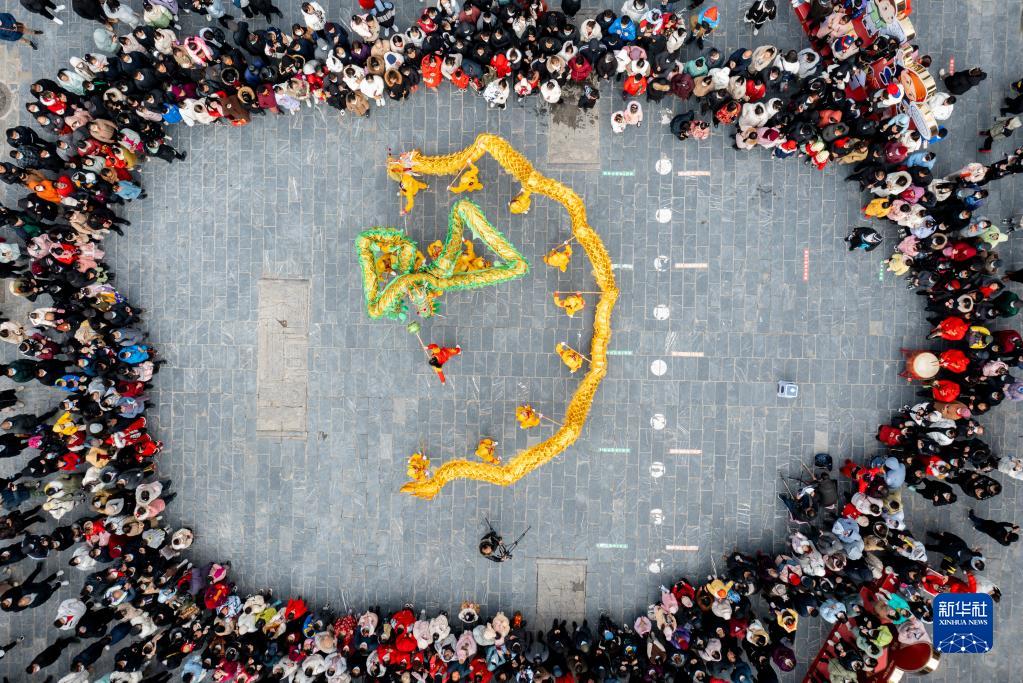 1月24日,民俗表演隊伍在安徽省合肥市肥西縣三河古鎮的“民間文化藝術(shù)節”活動(dòng)上表演舞龍(無(wú)人機照片)。