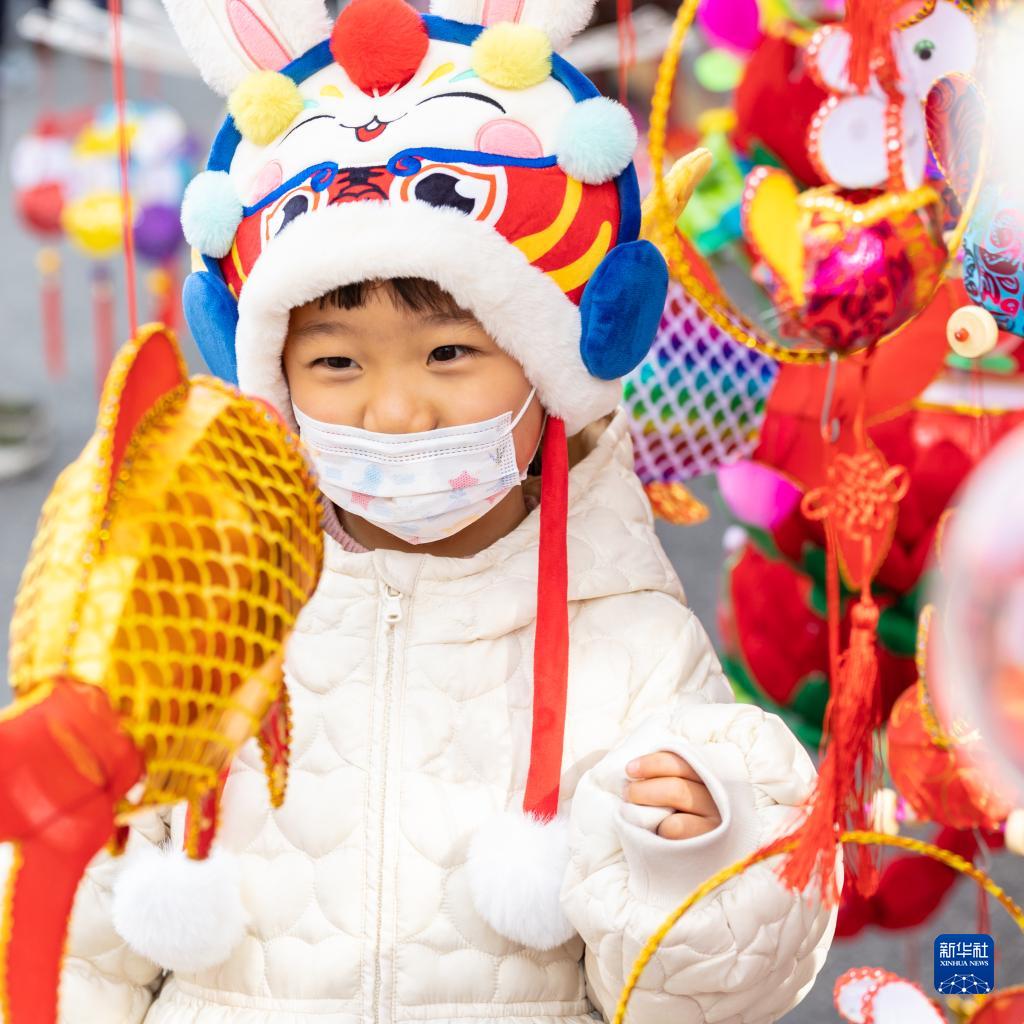 1月25日,在南京夫子廟東牌樓的集市上,小朋友被花燈吸引。
