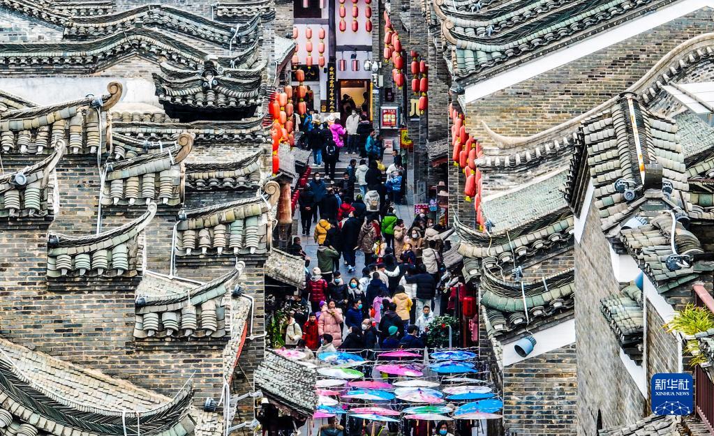 1月25日,游客在廣西桂林市東西巷趕大集(無(wú)人機照片)。