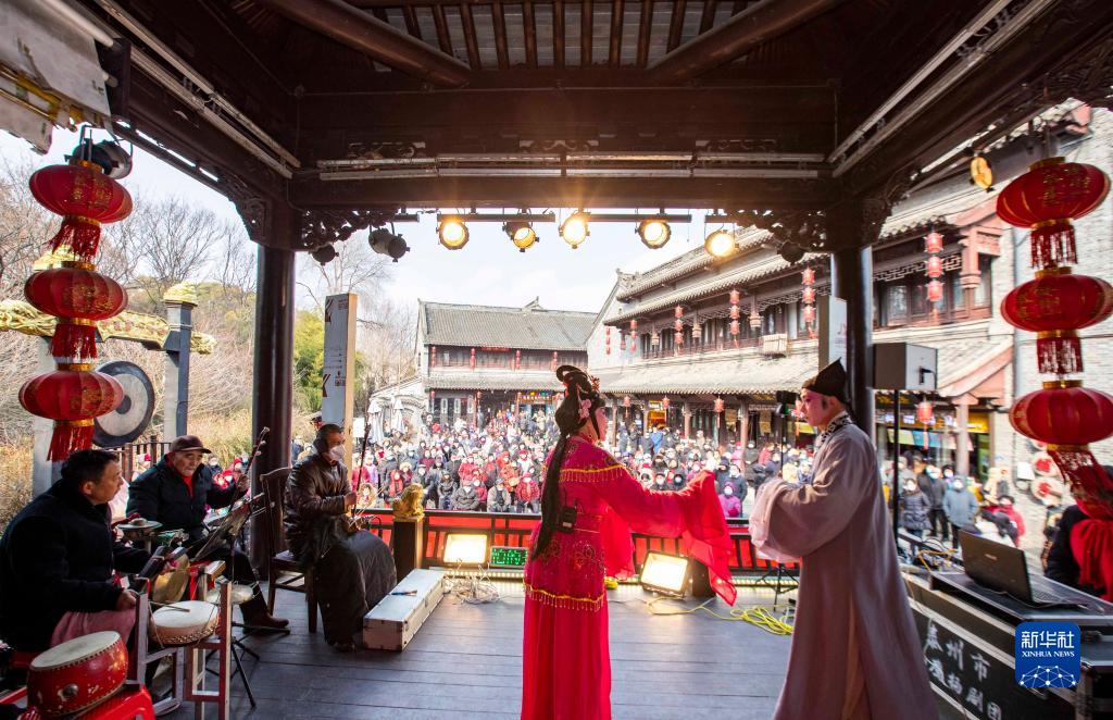 1月24日,江蘇省泰州市海陵區小鷹揚劇團在泰州老街古戲臺表演揚劇《珍珠塔·贈塔》選段。