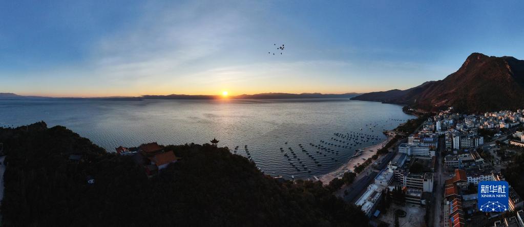 這是1月22日拍攝的云南省玉溪市撫仙湖日出(無(wú)人機照片)。