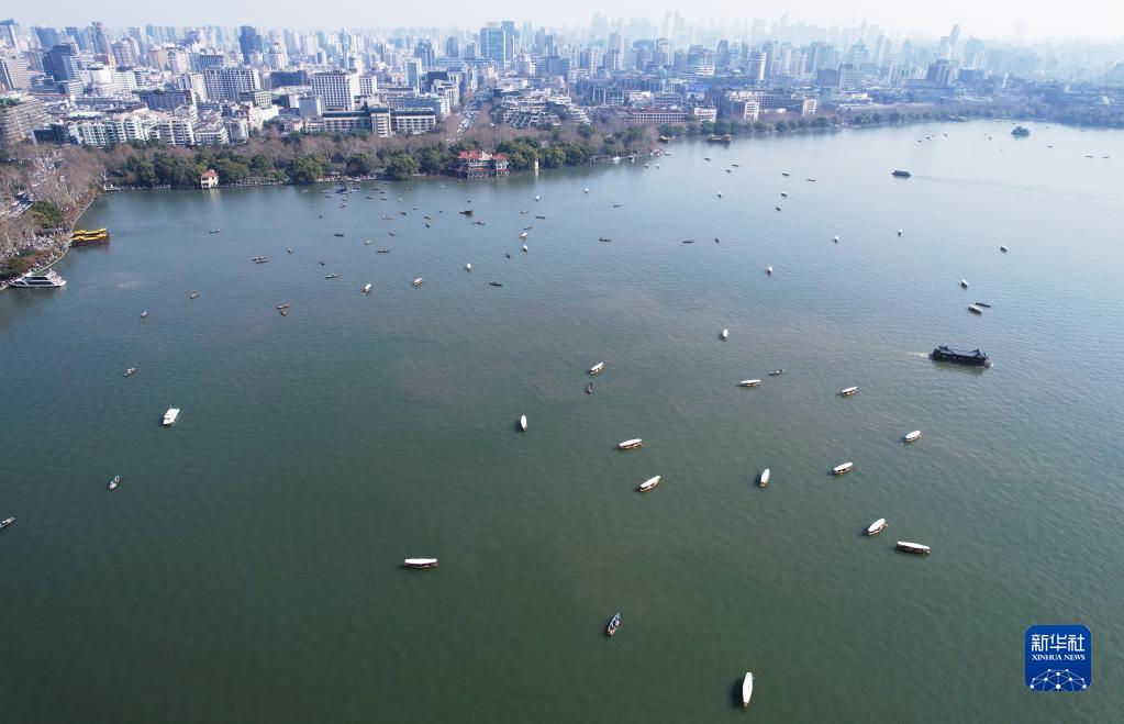 1月25日,游客乘船游覽杭州西湖(無(wú)人機照片)。