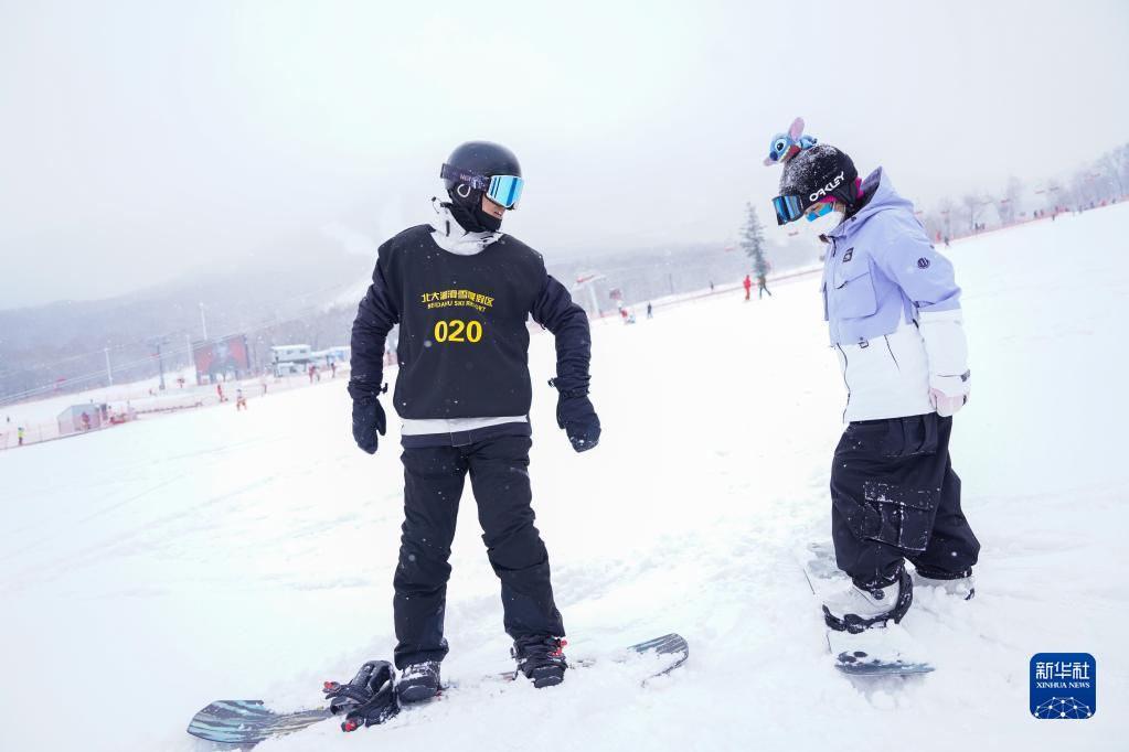邵鋒(左)在北大湖滑雪度假區內進(jìn)行滑雪教學(xué)(1月19日攝)。
