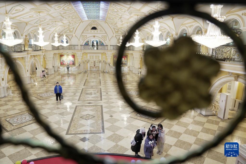 1月26日,游客在哈爾濱伏爾加莊園建筑內部參觀(guān)、拍照。