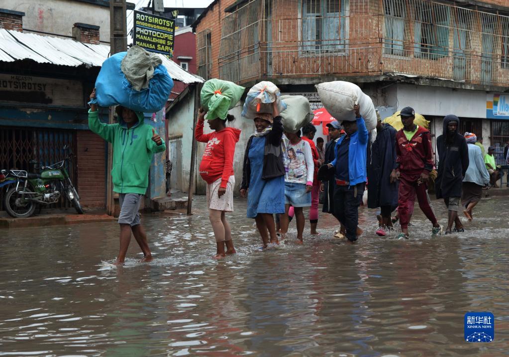 1月25日,在馬達加斯加首都塔那那利佛,行人走過(guò)積水的道路。