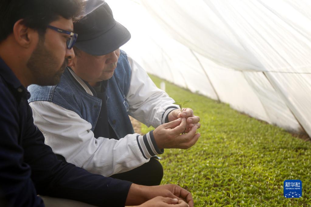 1月16日,在位于巴基斯坦旁遮普省木爾坦的中巴辣椒訂單種植項目辣椒育苗大棚內,中國農業(yè)專(zhuān)家趙建華(右)帶領(lǐng)巴基斯坦技術(shù)員薩賈德查看辣椒秧苗生長(cháng)情況。