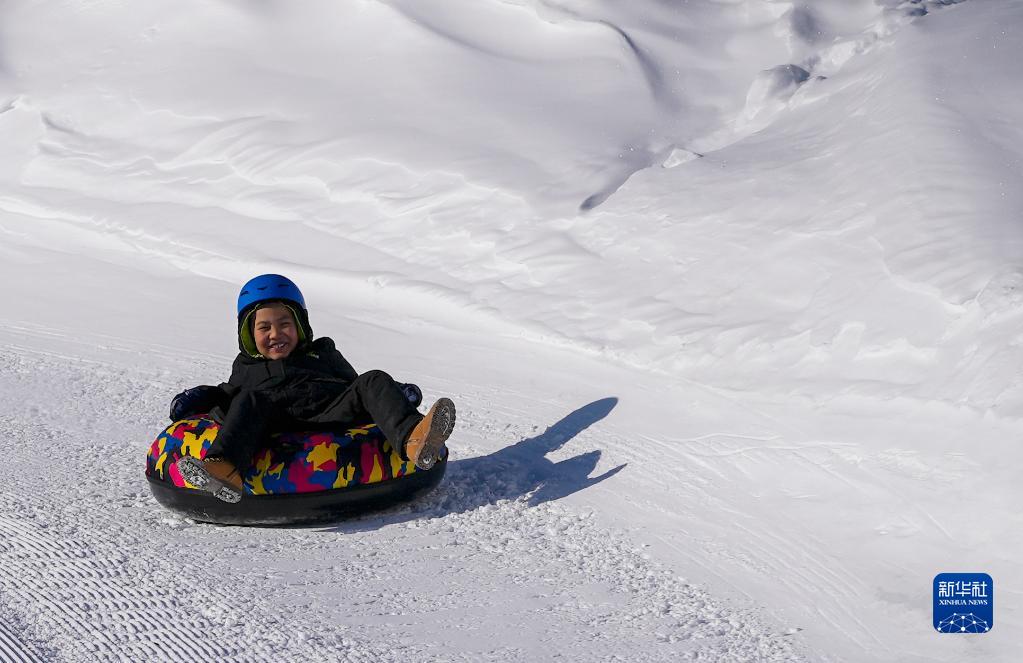 在絲綢之路國際滑雪場(chǎng),小朋友在玩雪圈(1月25日攝)。