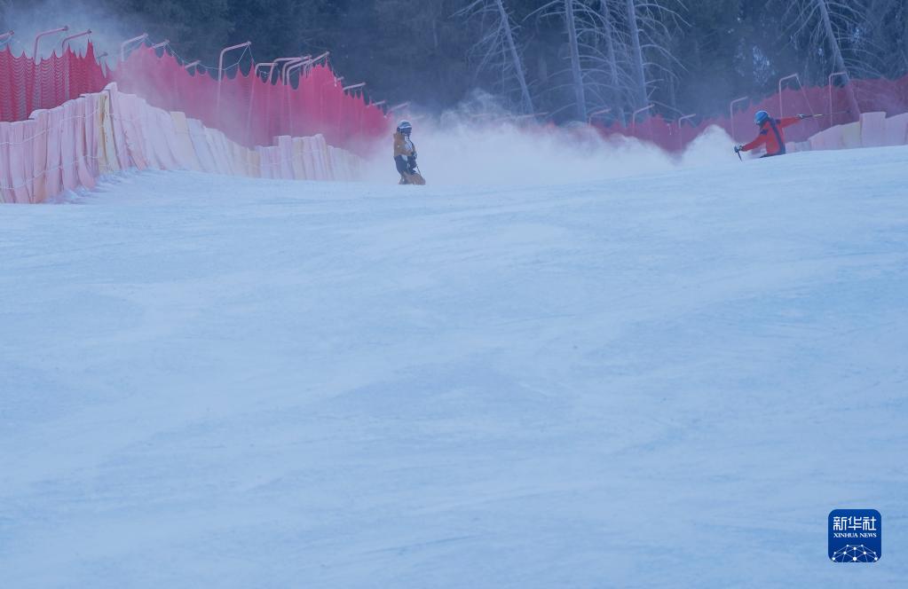 滑雪愛(ài)好者在絲綢之路國際滑雪場(chǎng)一處雪道上滑雪(1月25日攝)。